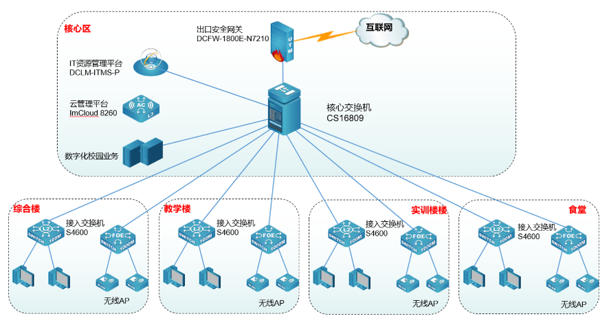 CloudStone 16800独有的管理、控制、数据三平面物理分离,每个平面互不影响,即使管理和控制平面都出现问题,数据仍正常转发,此外CloudStone 16800表项动态可调,支持N:11:N虚拟化,智能感知园区网和数据中心网络对核心设备的不同需求,顺利获得VSF虚拟化技术实现整个虚拟化系统中跨设备的链路聚合,简化网络配置,提高了网络连接的带宽和可靠性,保证网络的稳定运行。方便未来网络的扩展。接入层分区具有高密度的接入能力,采用S4600系列具备千兆光口上联,给予主机和服务器的接入,该层支持基于主机端口的访问控制,满足安全的接入,出口采用下一代防火墙DCFW-1800E-N7210,启用了访问控制,攻击防护,流量管控功能,保证网络和用户的安全。同时为实现对学校所有的IT网络资源的全方位监控管理,部署了DCLM-ITMS IT资源管理平台,方便网络管理人员对分散的无线和有线局域网设备进行统一管理,及时发现网络故障。